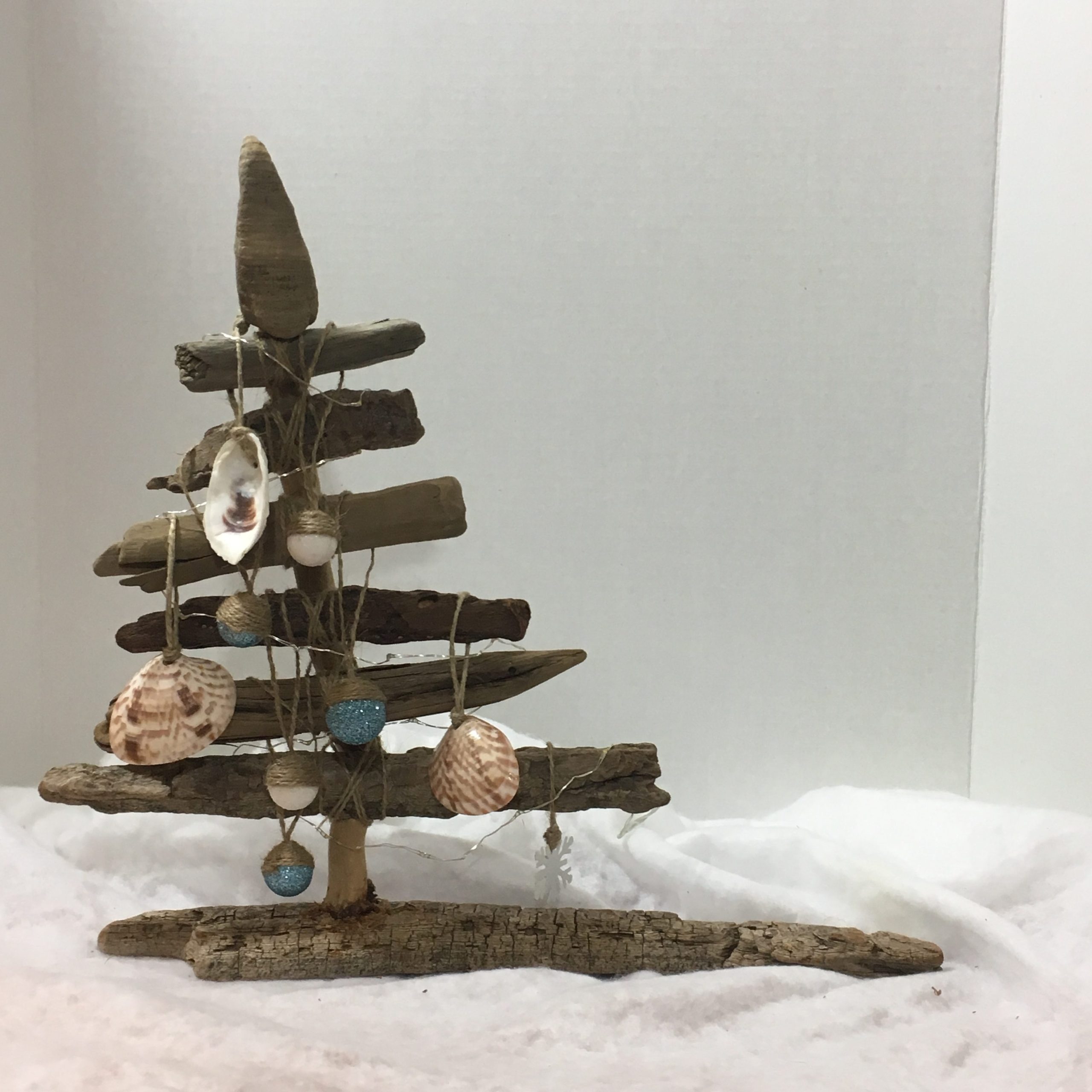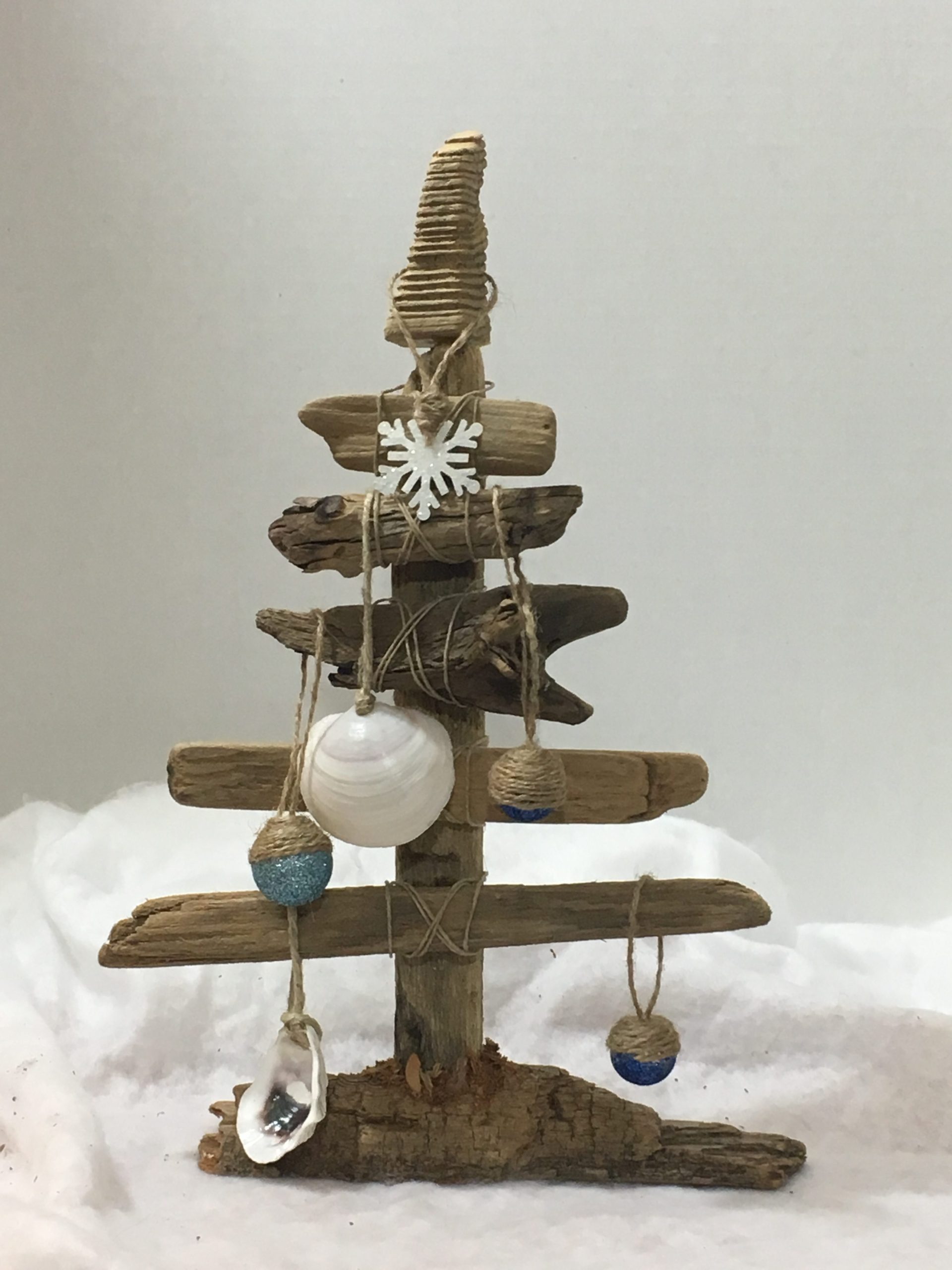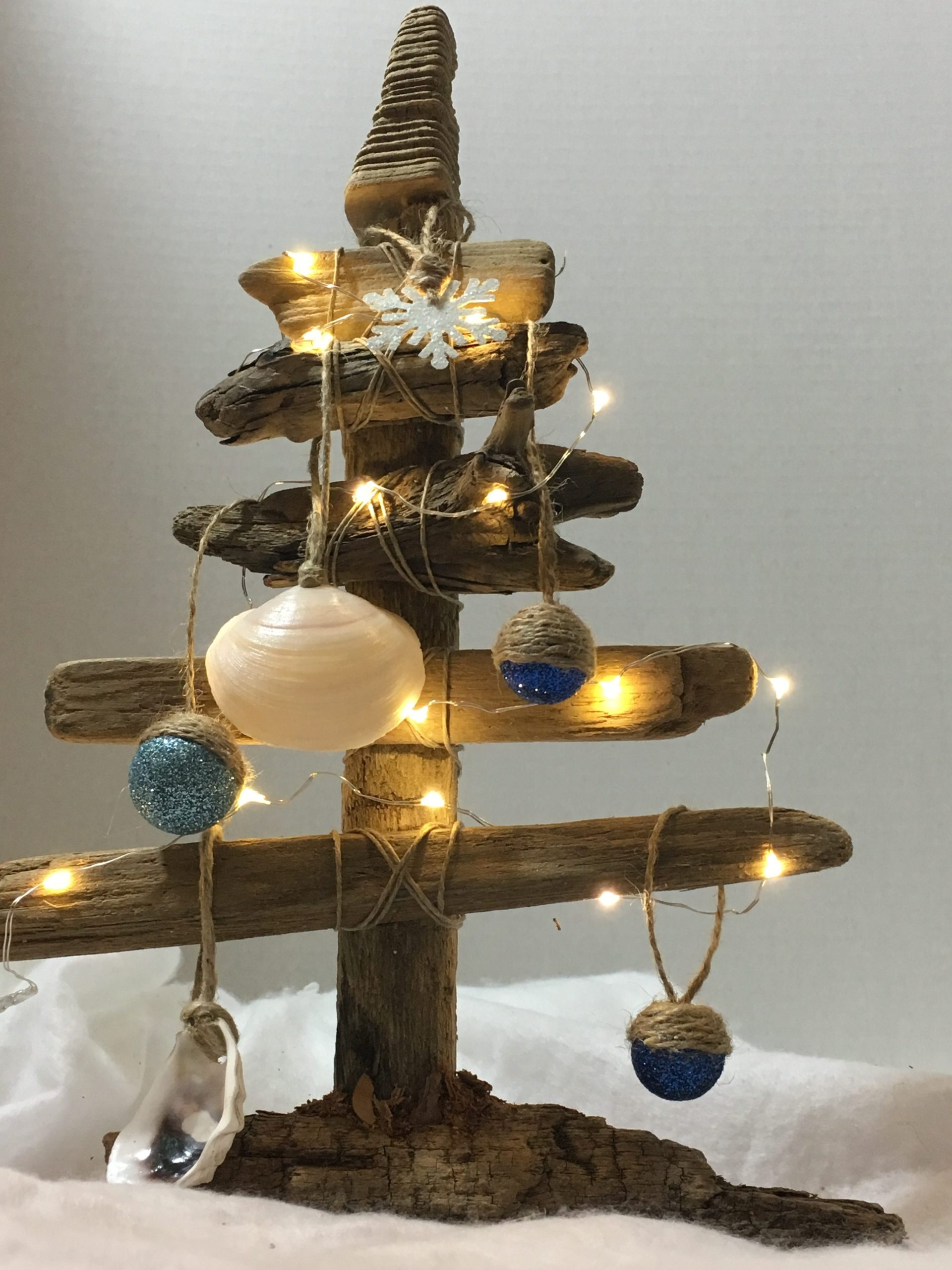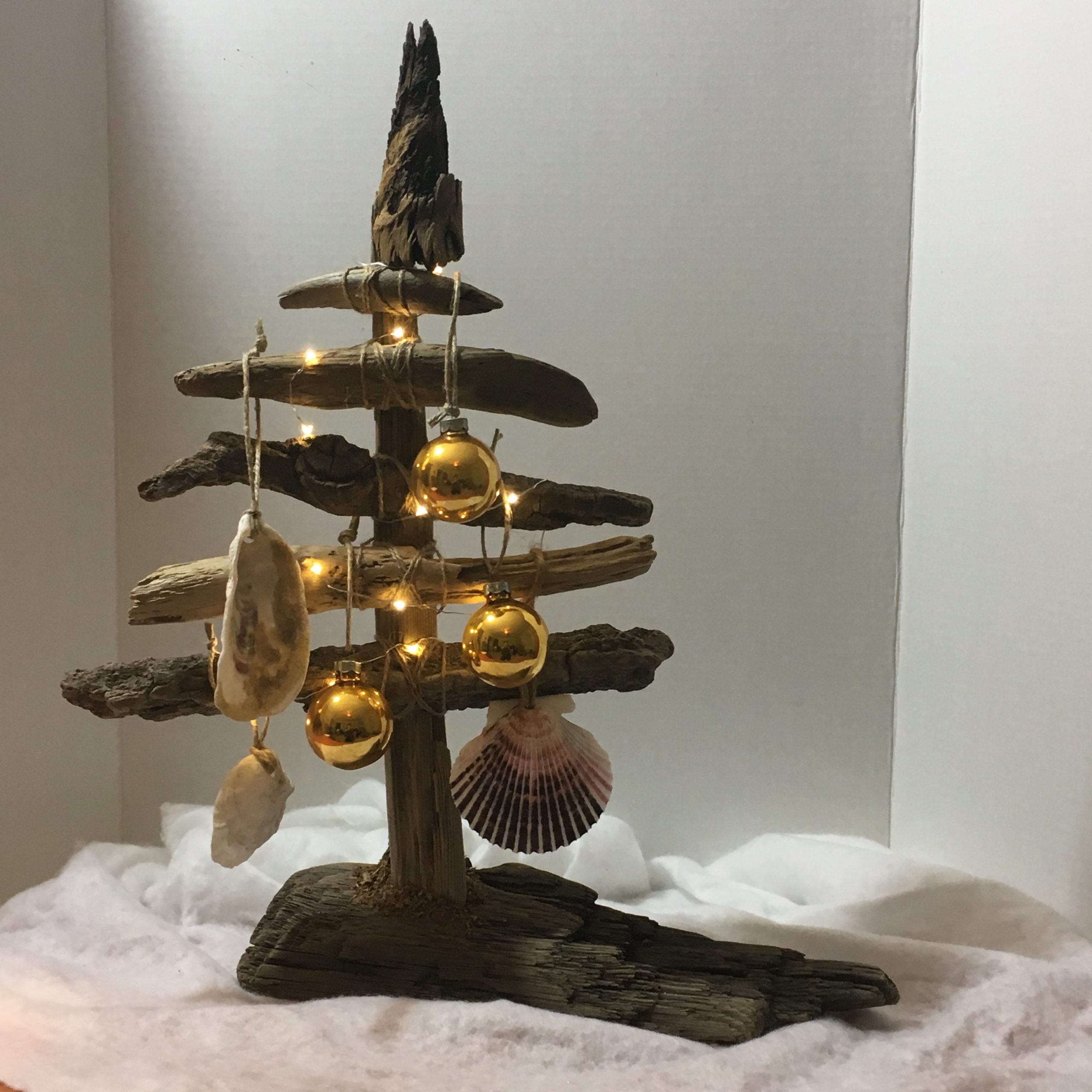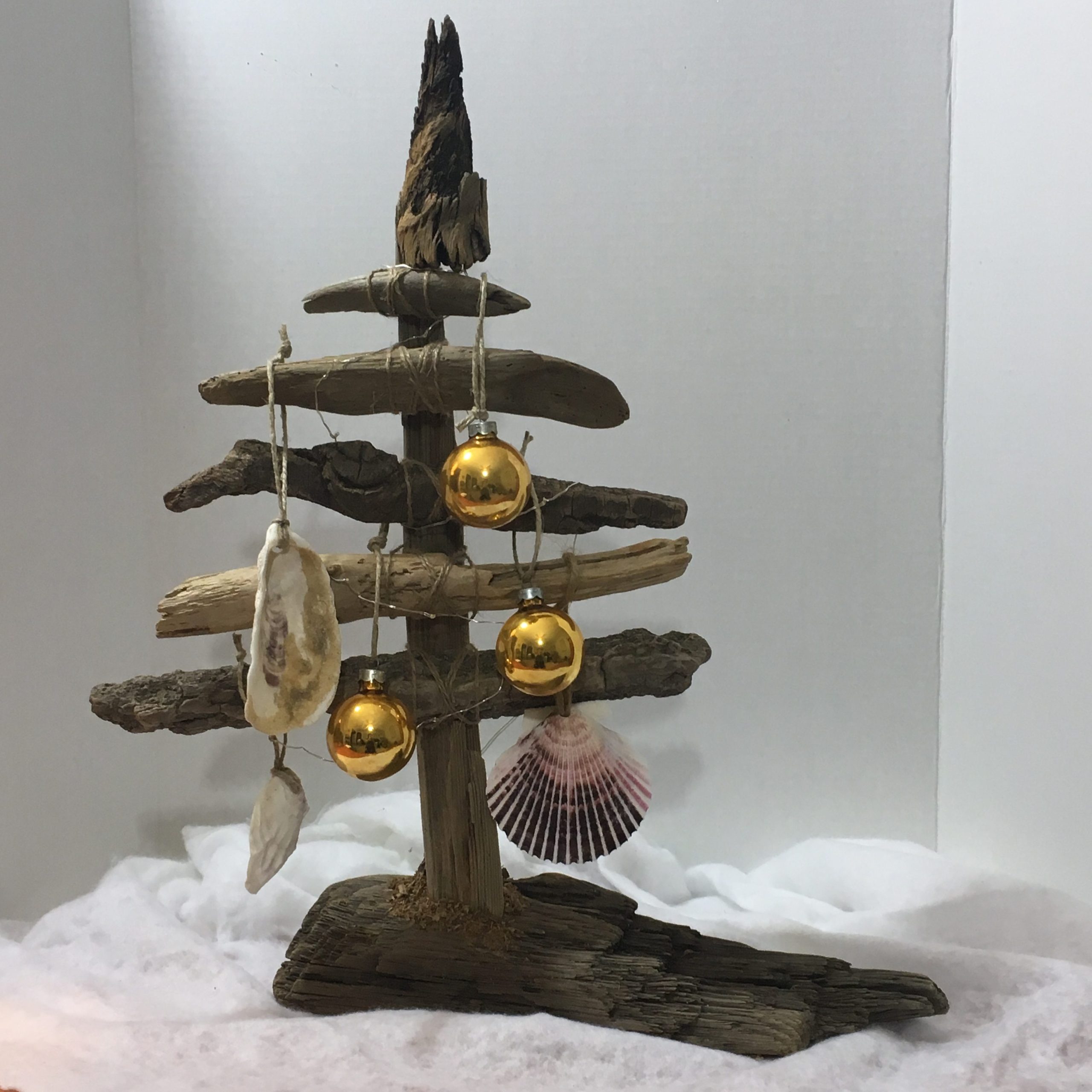 Ocean-tumbled pieces of New England driftwood, left in their natural tone. Shapes are all unique to the ocean and not manipulated in any way. Starting with a heavy driftwood base to weight the tree, each limb is carefully matched to create the perfect holiday tree. All trees include a combination of upcycled glass bulbs and natural shell ornaments for you to decorate as desired.